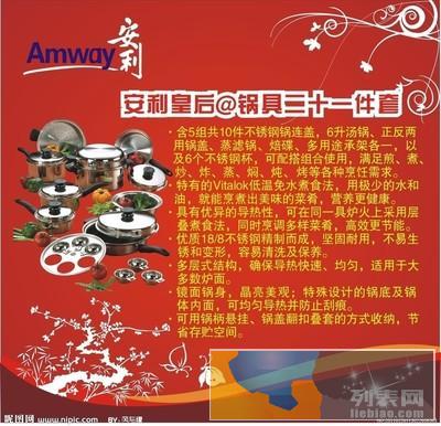 ·安利皇后锅具含5组共10件不锈钢锅连盖,6升汤锅、正反两用锅盖、蒸滤锅、焙碟、多用途承架各一,以及6个不锈钢杯,可配搭组合使用,满足煎、煮、炒、炸、 蒸、焖、炖、烤等各种烹饪需求。 ·特有的低温免水煮食法,用极少的水和油,就能烹煮出美味的菜肴,营养更健康。 ·具有优异的导热性,可在同一具炉火上采用层叠煮食法,同时烹调多样菜肴,高效更节能。 ·优质18/8不锈钢精制而成,坚固耐用,不易生锈和变形,容易清洗及保养。 ·多层式结构,确保导热快速、均匀,适用于大多数炉面。 ·镜面锅身,晶亮美观;特殊设计的锅底及锅体内面,可均匀导热并防止刮痕。 ·可用锅柄悬挂、锅盖翻扣叠套的方式收纳,节省存贮空间。安利产品包括:纽崔莱营养保健食品;雅姿美容护肤化妆品;优生活日用家居护理品;安利个人护理品;安利皇后锅具;逸新空气净化器;益之源净水器;全新正品,欢迎选购!互联网安利专卖店经理:左先生 竭诚为您服务!